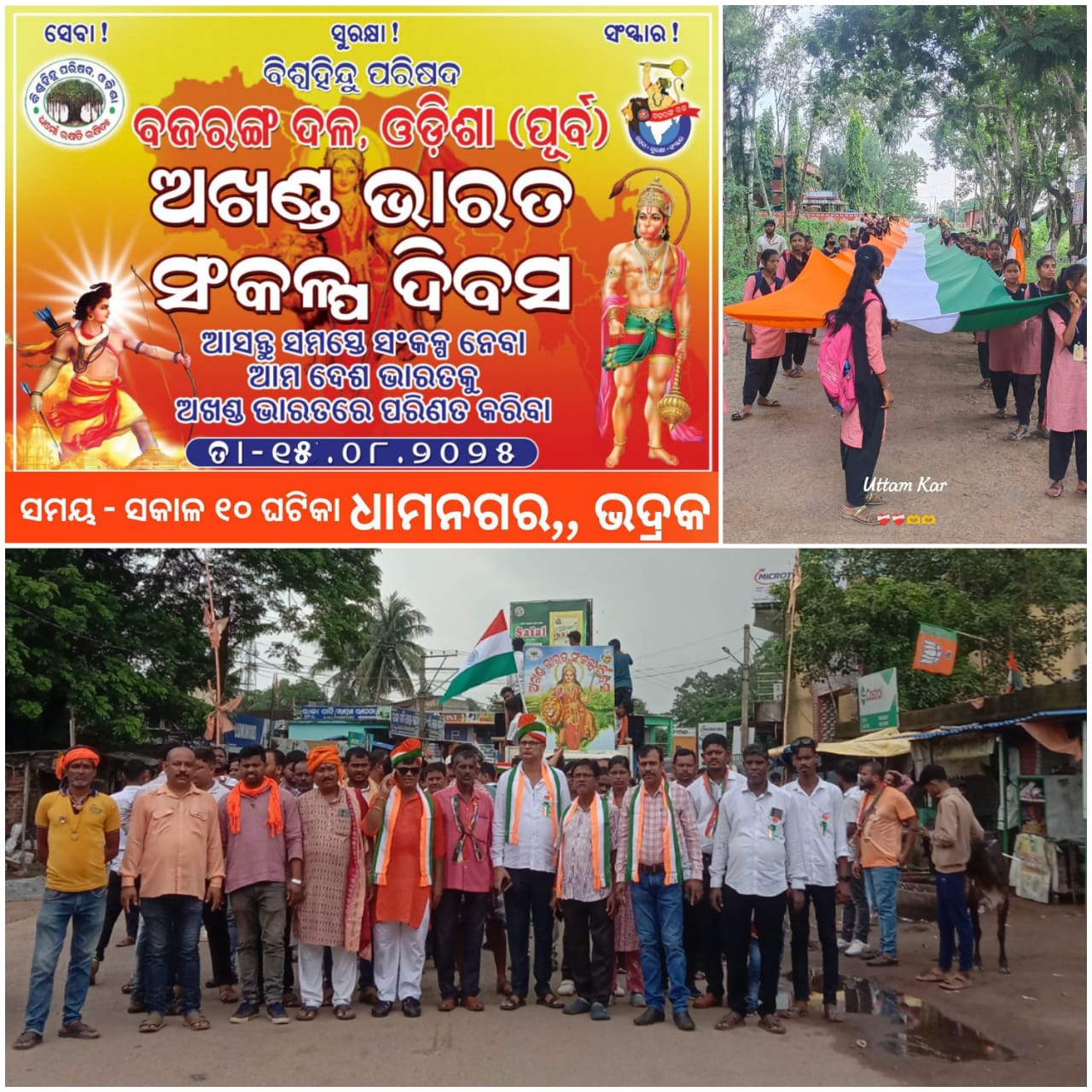 ଭଦ୍ରକ ଜିଲ୍ଲା (ଆମ ଓଡିଶା ଖବର )ଧାମନଗର ପ୍ରଖଣ୍ଡ ବଜରଙ୍ଗ ଦଳ ତରଫରୁ ଅଖଣ୍ଡ ଭାରତ ସଂକଳ୍ପ ଦିବସ ପ୍ରତି ବର୍ଷ ପରି ଚଳିତ ବର୍ଷ ମଧ୍ୟ ପାଳନ ଅବସରରେ ଏକ 300 ଫୁଟ୍ ଲମ୍ବର ତ୍ରିରଙ୍ଗା ପତାକା ଧରି ଧାମନଗର ନଗର ପରିକ୍ରମା କରାଯାଇଥିଲା ଶତାଧିକ ବଜରଙ୍ଗ ଦଳର କାର୍ଯ୍ୟକର୍ତ୍ତା ମାନଙ୍କ ସହ ବିଦ୍ୟାର୍ଥୀ ମାନଙ୍କର ସହଯୋଗ ରେ କାର୍ଯ୍ୟକ୍ରମ ଟି ସଫଳ ହୋଇଥିଲା,ଭଦ୍ରକ ଜିଲ୍ଲା ପ୍ରତିନିଧି ଶିଶିର କୁମାର ସ୍ଵାଇଁ ଙ୍କ ରିପୋର୍ଟ ଆମ ଓଡ଼ିଶା ଖବର,
