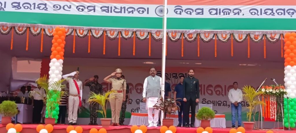 ୭୯ ତମ ସ୍ୱାଧୀନତା ଦିବସ ରାୟଗଡ ଜିଲ୍ଲା ସଦର ମହକୁମାର ସ୍ଥାନୀୟ ଜି.ସି.ଡି. ଜିଲ୍ଲା ଉଚ୍ଚ ବିଦ୍ୟାଳୟ ପଡିଆ ଠାରେ ଅନୁଷ୍ଠିତ ହୋଇଯାଇଛି । ଏହି ଉତ୍ସବରେ ଶ୍ରୀଯୁକ୍ତ ଗୋକୁଳାନନ୍ଦ ମଲ୍ଲିକ ,ମାନ୍ୟବର ମନ୍ତ୍ରୀ,ମତ୍ସ୍ୟ ଓ ପ୍ରାଣୀ ସମ୍ପଦ ବିକାଶ,ଅଣୁ,କ୍ଷୁଦ୍ର ଓ ମଧ୍ୟମ ଉଦ୍ୟୋଗ ବିଭାଗ,ଓଡିଶା ସରକାର ଯୋଗଦାନ କରି ସକାଳ ଘ. ୯.୧୫ ସମୟରେ ଜାତୀୟ ପତାକା ଉତ୍ତୋଳନ କରିବା ସଙ୍ଗେ ସଙ୍ଗେ ପ୍ୟାରେଡ ଅଭିବାଦନ ଗ୍ରହଣ କରିଥିଲେ ଓ ଜିଲ୍ଲାବାସୀଙ୍କ ଉଦ୍ଦେଶରେ ସ୍ୱାଧୀନତା ଦିବସ ପାଳନ ଅବସରରେ ଉଦବୋଧନ ଦେଇ କହିଥିଲେ ଯେ, ଯେଉଁ ମାଟିରୁ ଦିନେ ଶୁଭିଥିଲା ମୁକ୍ତିର ତୁର୍ଯ୍ୟନlଦ, ସ୍ୱାଧୀନତାର ରଣଦୁନ୍ଦୁଭି ବଜାଇ ଜାତିପ୍ରେମ ବହ୍ନିକୁ ପ୍ରଜ୍ଜଳିତ କରିଥିଲେ ଯେଉଁ ମାଟିର ସନ୍ତାନ, ସେହି ରାୟଗଡ଼ ମାଟି ମା’କୁ ସର୍ବ ପ୍ରଥମେ ପ୍ରଣାମ କରିଥିଲେ l ମୁକ୍ତି ଯୋଦ୍ଧାର ସହୀଦ ବୀରମାନଙ୍କୁ ଶ୍ରଦ୍ଧା ସୁମନ ଅର୍ପଣ କରିଥିଲେ l