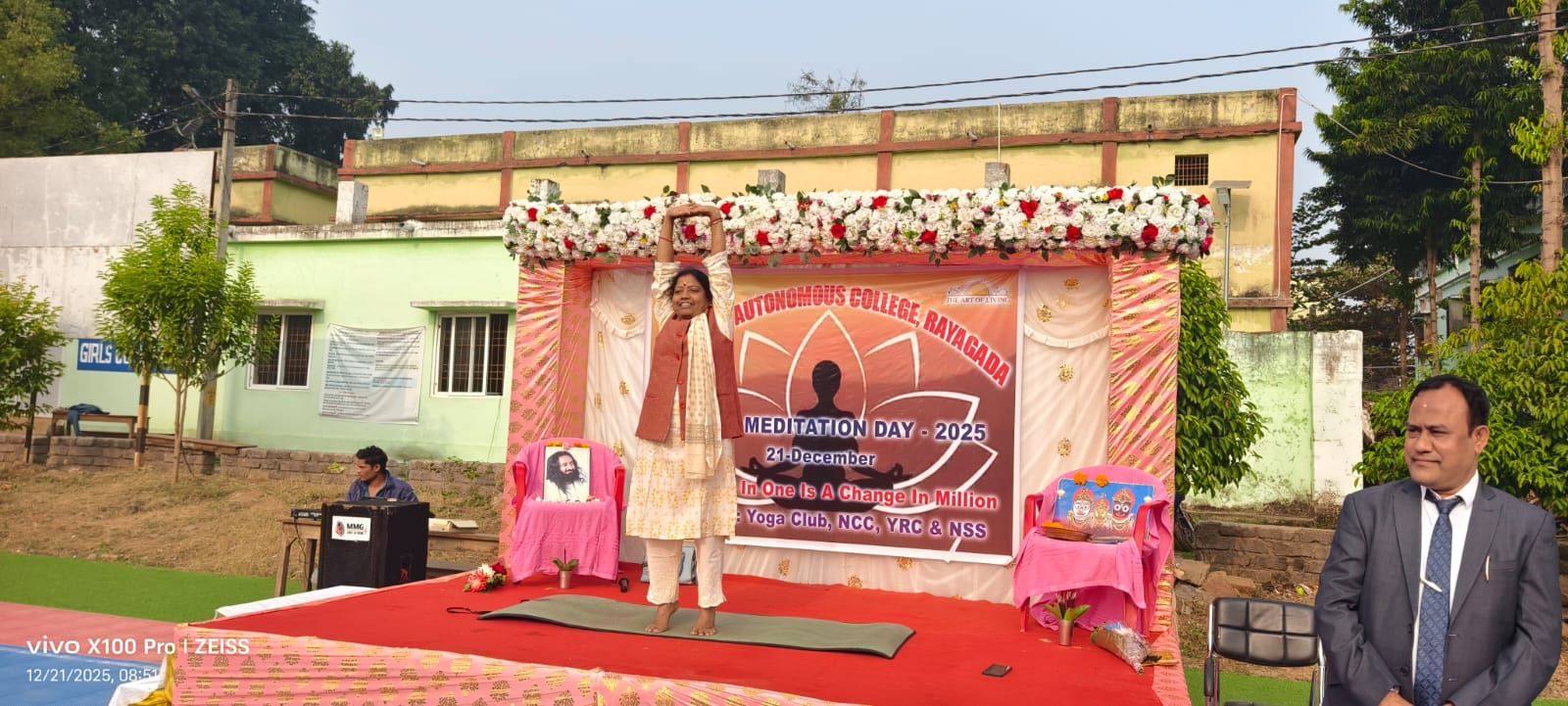ରାୟଗଡା ଜିଲ୍ଲା (ଆମ ଓଡିଶା ଖବର )ତା -୨୧-୧୨- ‘ବ୍ୟକ୍ତିଗତ ପରିବର୍ତନରେ ସମଷ୍ଟିର ପରିବର୍ତନ’ ବାର୍ତ୍ତା ବହନ କରୁଥିବା ଦ୍ୱିତୀୟ ବିଶ୍ୱ ଧ୍ୟାନ ଦିବସ ଆଜି ରାୟଗଡ ସ୍ୱୟଂଶାସିତ ମହାବିଦ୍ୟାଳୟର କ୍ରୀଡା ପ୍ରାଙ୍ଗଣ ରେ ଅନୁଷ୍ଠିତ ହୋଇଯାଇଛି। ଏହି ଉତ୍ସବକୁ ଅନୁଷ୍ଠାନିକ ଭାବେ ଉଦଘାଟନ କରିଥିଲେ ଅଧ୍ୟକ୍ଷା ଡ. ସରସ୍ବତୀ ରାୟ ଏବଂ ମୁଖ୍ୟ ଅତିଥି ମହର୍ଷି ବିଦ୍ୟାମନ୍ଦିର ଅଧ୍ୟକ୍ଷ ରଞ୍ଜନ ସାହୁ। ଉଭୟେ ନିଜ ବକ୍ତବ୍ୟରେ ଧ୍ୟାନ ର ଉପାଦେୟତା ସମ୍ପର୍କରେ ବୁଝାଇ ଥିଲେ। ମୁଖ୍ୟ ଅତିଥି ଧ୍ୟାନକୁ ଅଭ୍ୟାସରେ ପରିଣତ କରିବାପାଇଁ ସମସ୍ତଙ୍କୁ ଉପଦେଶ ଦେଇଥିଲେ। ଅଧ୍ୟକ୍ଷା ତଥା ଆର୍ଟ ଅଫ ଲିଭିଂ ପ୍ରଶିକ୍ଷିକା ଡ. ସରସ୍ବତୀ ରାୟ ସହାଭାଗୀ ମାନଙ୍କୁ ବିଭିନ୍ନ ଯୋଗାସନ ଶିକ୍ଷା ଦେବାସହ ଗୁରୁଦେବ ଙ୍କ ନିର୍ଦେସିତ ପଞ୍ଚକୋଷ ଧ୍ୟାନ କରାଇ ଥିଲେ।ଏହି କାର୍ଯ୍ୟକ୍ରମ କୁ ପରିଚାଳନା କରିଥିଲେ ଅଧ୍ୟାପକ ଏମ. ଶ୍ରୀନିବାସ ଅଚାରୀ। ଧ୍ୟାନର ଅନୁଭବ କୁ ବାଣ୍ଟି ଥିଲେ ଲେଫ୍ଟନାଣ୍ଟ ଉଦୟ ନାଏକ, ସୁବ୍ରତ ପ୍ରଧାନ, ଭବେଶ ମହାନ୍ତି, ପ୍ରିୟଦର୍ଶିନୀ ବଳ। କାର୍ଯ୍ୟକ୍ରମ ରେ ସହଯୋଗ କରିଥିଲେ ପି. ଅରୁଣ କୁମାର, ଅଜୟ ରୈତ, ମୋନାଲିସା ପାଣିଗ୍ରାହୀ, ଶଙ୍କର ପେଦୁର, ହେମନ୍ତ ସ୍ୱାଇଁ, ଅନିତା ସାହୁ, ମନୋଜ ପଟନାୟକ, ମନ୍ମଥ ଟୋଇକା ଇତ୍ୟାଦି। ଏହି ଧ୍ୟାନ ଉତ୍ସବ ରେ ବହୁ ସଂଖ୍ୟାରେ ଯୋଗଦେଇ ଛାତ୍ରଛାତ୍ରୀ ଓ ଅଧ୍ୟାପକ ଅଧ୍ୟାପିକା ଧ୍ୟାନର ଅନୁଭବ ନେଇଥିଲେ।