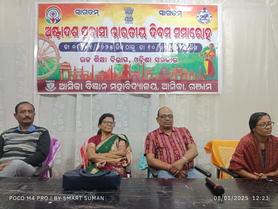 ଆସିକା ତା ୮/୧ : ଭାରତ ଏବଂ ଓଡ଼ିଶା ସରକାରଙ୍କ ଉଚ୍ଚ ଶିକ୍ଷା ବିଭାଗର ନିର୍ଦ୍ଦେଶକ୍ରମେ ଆସିକା ବିଜ୍ଞାନ ମହାବିଦ୍ୟାଳୟର ଭାରପ୍ରାପ୍ତ ଅଧ୍ୟକ୍ଷା ଡ. ସ୍ମିତାରାଣୀ ପଣ୍ଡାଙ୍କ ପୌରହିତ୍ୟରେ ଅଷ୍ଟାଦଶ ପ୍ରବାସୀ ଭାରତୀୟ ଦିବସ ସମାରୋହ ଏକ ନିରାଡ଼ମ୍ବର ପରିବେଶ ମଧ୍ୟରେ ସମ୍ପର୍ଣ୍ଣ ହୋଇଯାଇଛି। ଏହି ସମାରୋହରେ ଅକାଡେମିକ୍ ବର୍ସର ଡ. ସନ୍ତୋଷ କୁମାର ଚ଼ୌଧୁରୀ ମୁଖ୍ୟ ଅତିଥି ଥିବା ବେଳେ ଡ. ଅଭୟ କେଶରୀ ପରିଚ୍ଛା ପଟ୍ଟନାୟକ ମୁଖ୍ୟବକ୍ତା ରୂପେ ମଞ୍ଚାସୀନ ଥିଲେ। ଡ. ସସ୍ମିତା ପାତ୍ର ସଂଯୋଜିକା ରୂପେ ସମାରୋହର ମୁଖ୍ୟ ଉଦ୍ଦେଶ୍ୟ ସଂପାଦନ କରିଥିଲେ। ବେଦପାଠ ଗବୈୟା ଲାବାରୋଟରୀ ଶିକ୍ଷକ ଧନଞ୍ଜୟ ମହାପାତ୍ରଙ୍କ ଦ୍ବାରା ବେଦ ମନ୍ତ୍ରଧ୍ବନୀରେ ମଞ୍ଚାସୀନ ଅତିଥିଙ୍କ ଦ୍ବାରା ଦେବ ବିଗ୍ରହରେ ଚତୁର୍ଦ୍ଧାମୁର୍ତ୍ତୀଙ୍କୁ ପ୍ରଦୀପ ପ୍ରଜ୍ଜ୍ବଳନ କରାଯାଇଥିଲା।