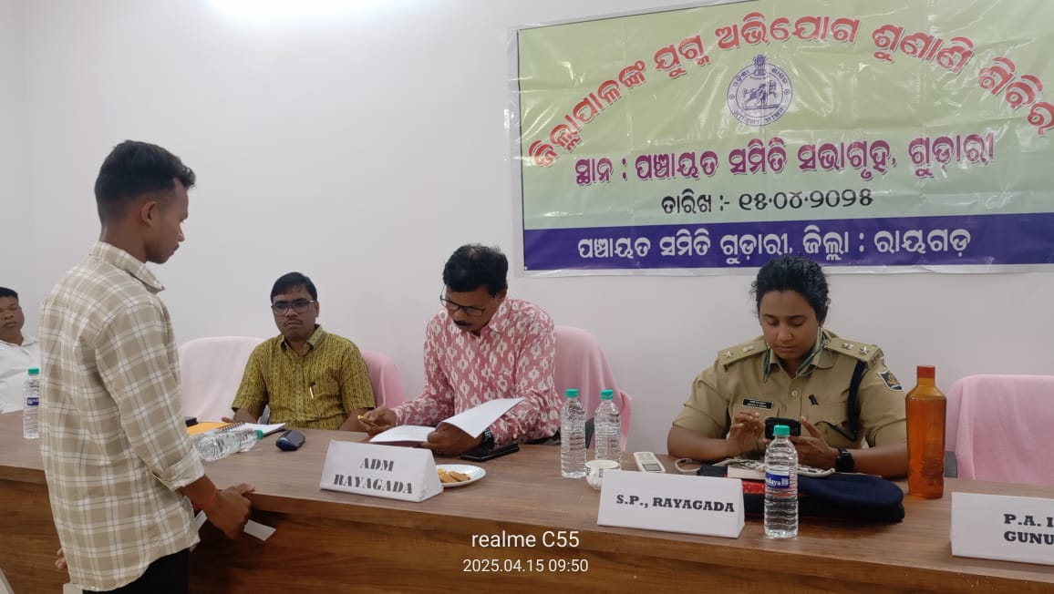 ଗୁଡାରି (ଆମ ଓଡିଶା ଖବର )ରାୟଗଡ:- ତା. ୧୫-୦୪-୨୦୨୫ରିଖ ଦିନ ଗୁଡାରି ବ୍ଲକ କାର୍ଯ୍ୟାଳୟର ସଭାଗୃହ ରେ ଜିଲ୍ଲାସ୍ତରୀୟ ଯୁଗ୍ମ ଅଭିଯୋଗ ଶୁଣାଣୀ ଶିବିର ଅନୁଷ୍ଠିତ ହୋଇ ଯାଇଛି। ଜିଲ୍ଲାପାଳ ପାରୁଲ ପଟୱାରୀଙ୍କ ନିର୍ଦେଶରେ ରାୟଗଡା ଅତିରିକ୍ତ ଜିଲ୍ଲାପାଳ ନବୀନ ଚନ୍ଦ୍ର ନାୟକଙ୍କ ଅଧ୍ୟକ୍ଷତା ରେ ଅନୁଷ୍ଠିତ ଏହି ଶିବିର ରେ ଆରକ୍ଷୀ ଅଧିକ୍ଷକ ସ୍ୱାତି ଏସ କୁମାର, ସମନ୍ୱିତ ଆଦିବାସୀ ଉନ୍ନୟନ ସଂସ୍ଥା ପ୍ରକଳ୍ପ ପ୍ରଶାସକ ଅଜୟ କୁମାର ପ୍ରଧାନ, ସିଡିଏମଓ ପ୍ରଫୁଲ୍ଲ କୁମାର ପାଢ଼ୀ ଯୋଗଦେଇ ଅଭିଯୋଗର ଶୁଣାଣୀ କରିଥିଲେ। ବିଡ଼ିଓ ସୁଚିସ୍ମିତା ବେହେରାଙ୍କ ତତ୍ୱାବଧାନ ରେ ପରିଚାଳିତ ଏହି କାର୍ଯ୍ୟକ୍ରମରେ ଆଜି ମୋଟ ୧୭ ଟି ଅଭିଯୋଗ ର ଶୁଣାଣୀ ହୋଇଥିବା ବେଳେ, ସେଥିରୁ ୦୧ଟି ସାମୁହିକ ଓ ୧୬ ଟି ବ୍ୟକ୍ତିଗତ ଥିବା ଜଣା ପଡ଼ିଛି। ଏଥିରେ ଜିଲ୍ଲାର ବିଭିନ୍ନ ବିଭାଗର ଅଧିକାରୀ ମାନେ ଯୋଗ ଦେଇଥିଲେ।